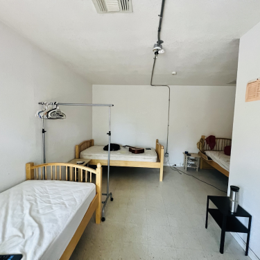 Reserve one bed in a dorm room with a total of three beds. There is an attached bathroom with a shower, sink, and toilet.