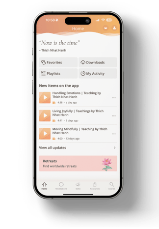 这是对眼睛的正念。通过创造正念的能量,意识到眼睛,并对它们微笑,我们正在触及我们已经拥有的幸福条件之一。我们仍然能够看到的事实是一个奇迹。简单地睁开眼睛,我们就能见证一个充满色彩和图像的世界。